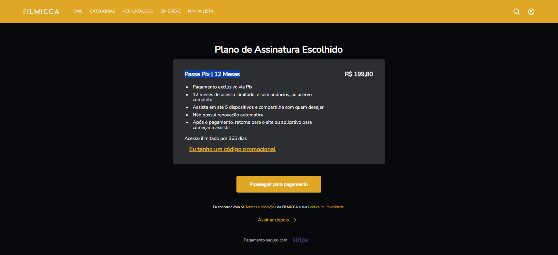 Confirme o valor de R$ 150 e prossiga para pagamento via Pix e realize o mesmo para seu acesso ser liberado e você garantir um ano inteiro de FILMICCA <3